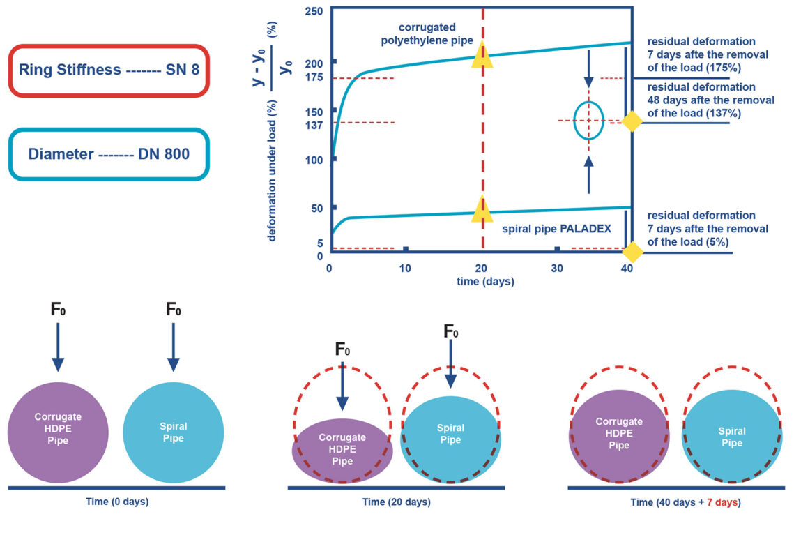 Nella seguente tabella sono evidenziati i dati relativi a prove di deformazione sotto carico eseguite su tubi a parità di diametro (DN/ID 800) e di rigidità anulare (classe A = SN8). In queste prove è stato applicato un carico tale da imporre una deformazione iniziale Y0 pari al 3% del diametro nominale. A titolo puramente esemplificativo sono stati esaminati un campione di tubo PALADEX® conforme alla norma UNI 11434 ed un campione di tubo corrugato in polietilene conforme alla norma EN 13476.