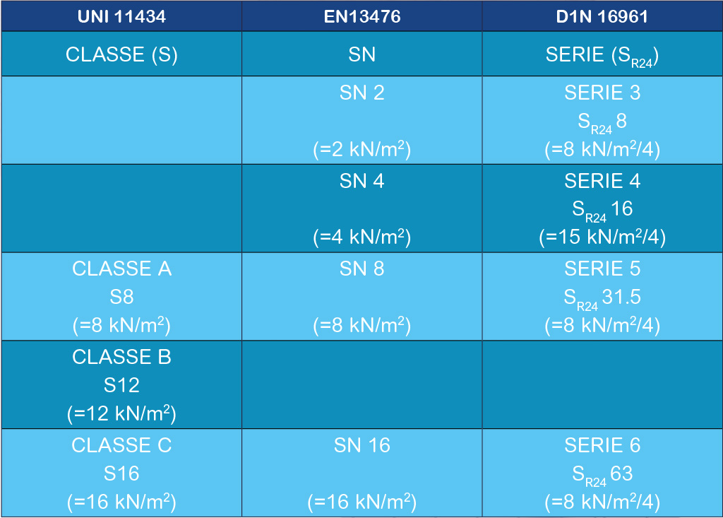 Ad esempio, un tubo spiralato in polietilene rinforzato con acciaio CLASSE A (=8 kN/m²) conforme alla normativa UNI 11434 ha una rigidità anulare equivalente ad un tubo strutturato interamente in polietilene SN8 conforme alla norma EN 13476:2007 e ad un tubo strutturato interamente in polietilene SERIE 5 – SR24 32 conforme alla normativa DIN 16961.